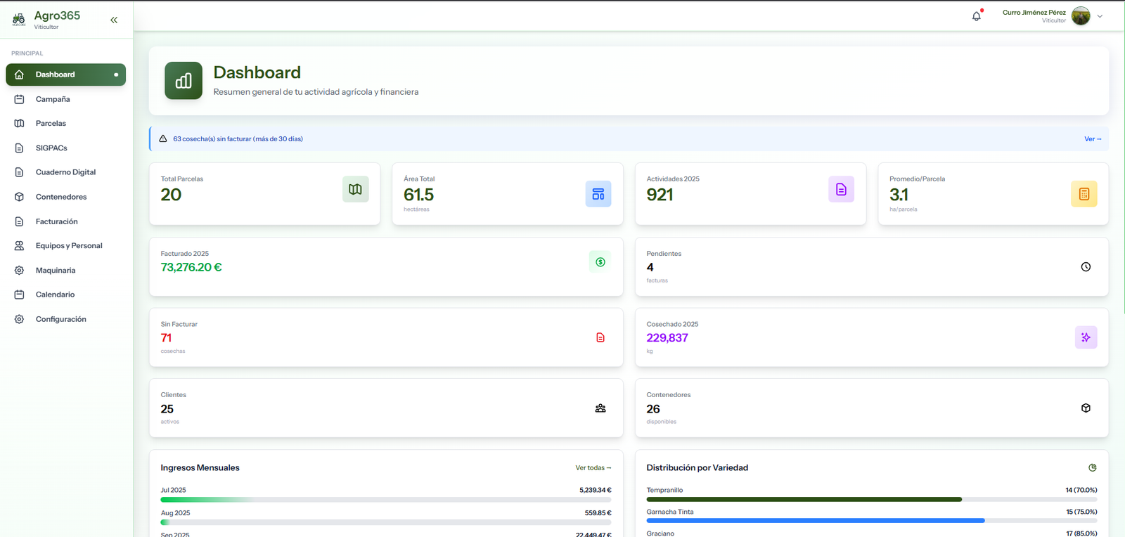 Saber másHerramientas profesionales para viticultores y bodegas: cuaderno de campo digital obligatorio, gestión de parcelas SIGPAC, informes oficiales con firma electrónica, control de vendimia y facturación integrada.